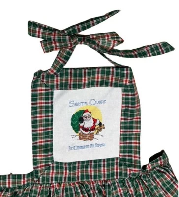 Adult Unisex Santa Claus To Town Christmas Full Apron With PocketsAdult Unisex handmade apron is handmade with cotton fabric.The bib has a cross stitch panel of Santa with the words Santa Claus Is Coming To TownThis is made to fit all size bodies from small to XXL.From the top of the bib to the hem it measures 34 inches but the long neck sashes means it will adjust to a longer length if needed.Side to side from the skirt part of the apron measures 20 inches but very long sashes means it can fit a XXL body if needed.A large pocket is 11 x 11 inches.Machine washable.