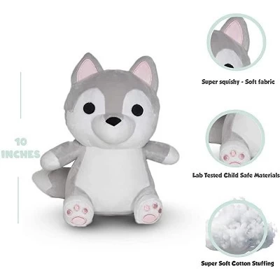 Super Squishy Gray wolf Plush – The adorable face and squeezable body of our gray wolf are made from premium cloth and filler from the outer fabric to the interior fillings. Our gray wolf plush has a durable coat, clump-resistant filling, and reinforced stitching. This huggable toy will keep your little one company through many adventures!