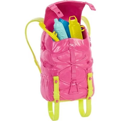 - Take the camping story from day to night with a backpack that opens and closes to store hiking essentials and a colorful sleeping bag that keeps Barbie doll and puppy cozy at night