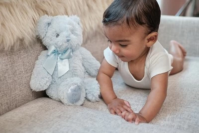 - Babys first bear: With ultra-soft fur and a hand-sewn nose, this adorable 12 blue teddy combines the look of a vintage bear with the softness of modern plush materials. The perfect first stuffed teddy for a keepsake gift to mark the birth of a little one