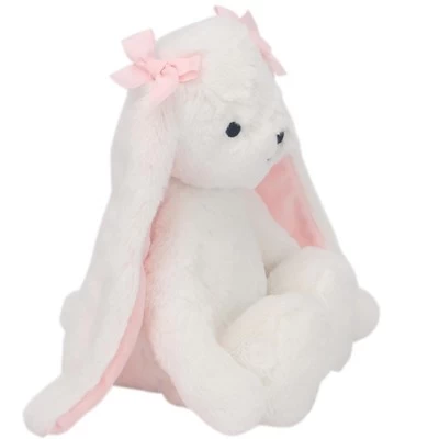 My name is Snowflake. I am a 13” tall white bunny with very long floppy ears. My furry body is soft and cuddly, and the inside of my ears are pink velour. I always wear pink bows and my eyes, nose, and mouth are embroidered so I am completely baby safe. I make the perfect baby shower gift or welcome home baby gift.