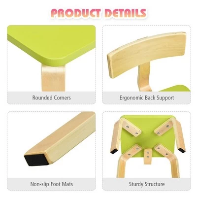 This is our 4-piece table and chair set, which is a perfect center for kids to enjoy eating, reading, creating and playing.Made of premium bentwood and sprayed with non-toxic paint, this kids furniture set is environmentally friendly and durable for a safe and reliable use. The sturdy legs and anti-slip foot mats ensure the furniture set is stable enough without easy wobble. Smooth surface and rounded corners will not hurt the delicate skin of children. In addition, it is easy to assemble and clean, which can greatly save your time and energy.