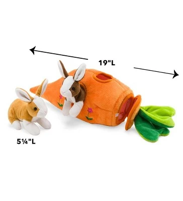 These adorable plush bunnies will hip, hip, hop all the way home to their soft carrot cottage. Plush Bunny Portable Play Set is large enough (19″L) to hold its two sweet and soft bunny residents comfortably, and can easily be carried along to a friend’s house for imaginative play. The bright orange carrot cottage features two windows for bunnies to peek out from, a swinging door that sticks shut, adorable embroidered flowers, and a soft green carrot top. Two 5¼”L sweet bunnies are ready to hop into whatever adventure awaits. This carrot cottage makes a perfect Easter basket stuffer, or just a surprise gift for a special child in your life. Every-bunny will love playing with these adorable critters!