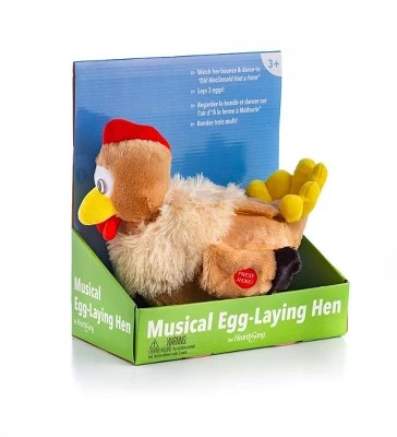 Our silly, musical chicken adds barnyard fun to playtime. Animal lovers will quickly call this sweet chick their best friend! The 10″L x 11″H hen has a soft, huggable plush head with goofy eyes beckoning laughter and affection. She bounces and lays eggs (3 included) to the tune of Old MacDonald Had a Farm (3 AA batteries required, not included). The colorful eggs are carefully loaded and stored on top of the hen’s body, covered by her plush wings. Bring this silly hen out at a playdate to encourage laughter. Makes a perfect Easter basket filler or anytime gift!