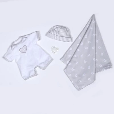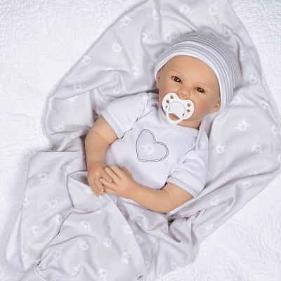 Paradise Galleries Little Elephant is ready to get out and about! This 18-inch realistic newborn baby doll wears a white graphic onesie with a printed heart decal, a grey and white striped knit cap, a diaper, and a magnetic pacifier. As you take Little Elephant out for a walk, keep him/her warm and cozy in a grey cotton swaddling blanket with an elephant print that this gender-neutral baby comes with!Little Elephant is lovingly sculpted by world-renowned doll artist Michelle Fagan. This lifelike infant doll is a part of our Swaddler Trio. This gender-neutral doll is 18 inches from head to toe, crafted from SoftTouch Vinyl with a weighted cloth body for that wonderfully lifelike feel with a fresh baby powder scent. Arriving to you in a Collectors Box along with a numbered Certificate of Authenticity with the artists signature. Intended for reborn doll collectors aged 3+.