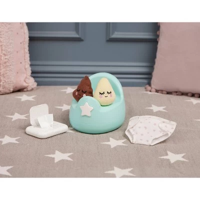- Includes: 1 potty that plays 2 fun sounds, 2 plushies, 1 box of pretend wipes, and 1 diaper.