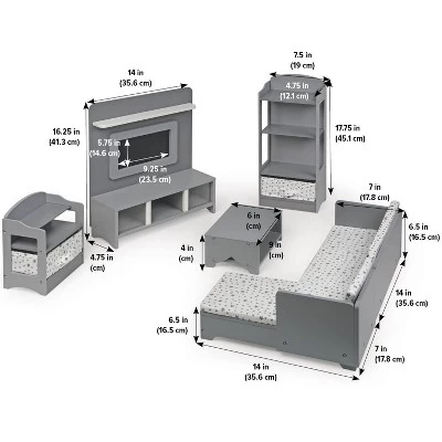 Badger Basket’s impressive Media Room Furniture Set for 18 inch Dolls will be the go-to place for gatherings with your friends and your dolls and stuffed animals. Includes a padded sectional sofa, two bookshelves (each with a storage basket), an entertainment center with a pretend television, and a spacious table. For children ages three and up and dolls up to 18 inches. Made with wood, MDF, fabric, and polyurethane foam. Wipe and spot clean as needed. Overall assembled dimensions of the media center: 14 inches L x 4.75 inches W x 16.25 inches H. Adult assembly required.