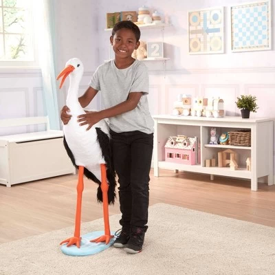 This lifelike plush stork really delivers! A terrific way to welcome a new baby and a great companion for years to come, this striking silky white stork with black wingtips and realistic details is sure to turn heads. Standing an impressive three-plus feet tall, this lifelike bird’s soft, squeezable body covered with silky feathers encourage hugs and cuddles, while quality construction and a strong interior structure keep it standing proudly for years to come. The stork can wear the included “Welcome, Baby!” bib, or “It’s a Girl!” and “It’s a Boy!” bibs are available for a personal touch. The stork’s long bright orange legs stand on an oval two-foot-long base for extra stability. Kids’ imaginations are sure to take flight with this beautiful feathered friend by their side!