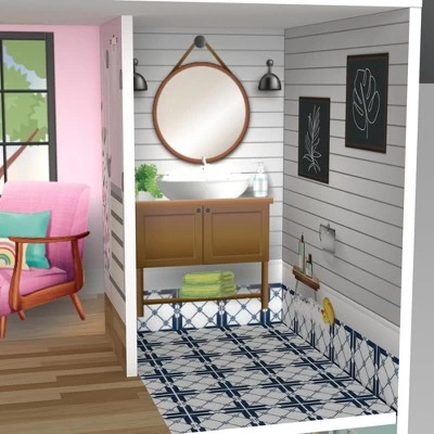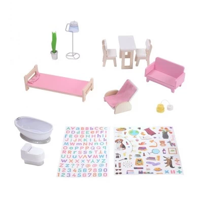 - 13 ACCESSORIES INCLUDED: Includes a bed, sofa, dining table and two chairs, two reusable sticker sheets, plant, lounge chair, floor lamp, pendant light, bathtub, and toilet with sound effect (requires three included LR44 batteries)