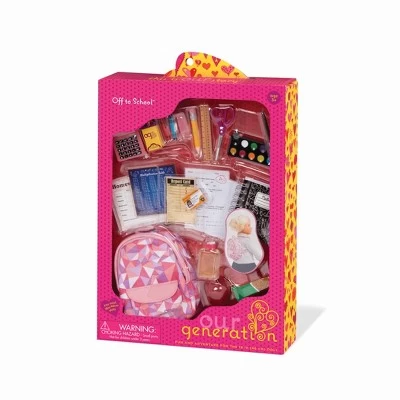 Get excited for school time fun with the Our Generation Off to School Accessory Set for 18-inch dolls! The cute pink backpack has a cool geometric print, front storage pocket, and large inner pocket that you can fill up with all of your doll’s school supplies. From notebooks, lined paper, and a homework schedule to pencils, erasers, and scissors, this school accessory set for dolls everything you need for A+ school adventures! Is your doll going to the Awesome Academy School Room this year? What subject is their favorite? The doll pictured with this set is Steffie. (Dolls, school room, and outfits sold separately, available at Target. Compatible with American Girl dolls.)