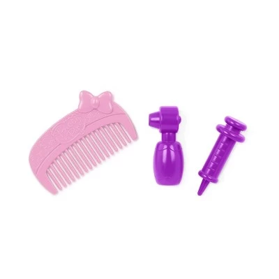 - 5-Piece Set: a stuffed animal puppy, a comb, a toy ear scope, a toy syringe, and a carrying bag for the dog.