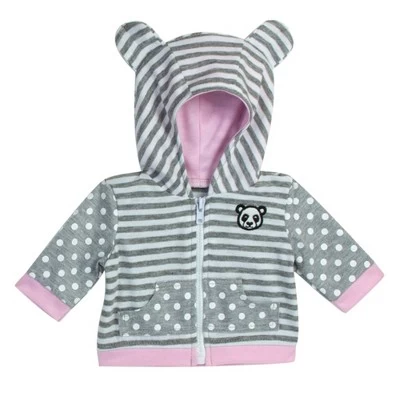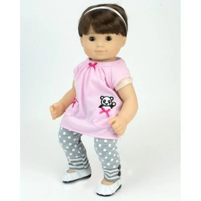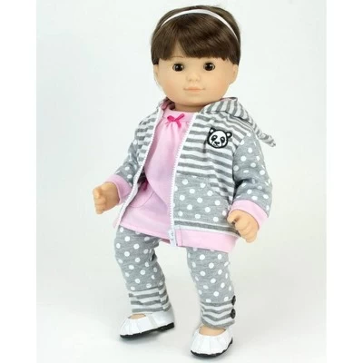 - DOLL CASUAL OUTFIT SET: Includes a panda bear gray striped zip up hooded sweatshirt, a pink tunic embroidered with a panda bear, and gray polka dot leggings with striped trim and buttons