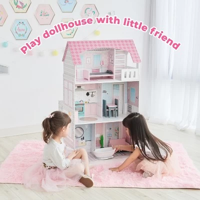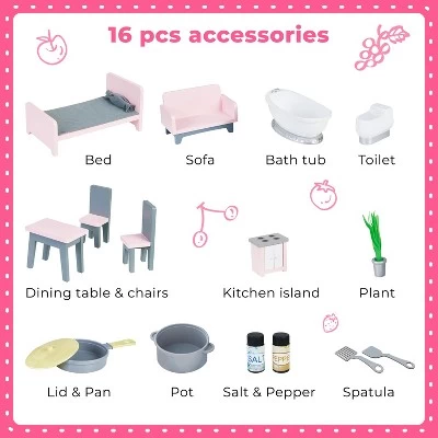 Help your little one create gourmet meals of their own with the Teamson Kids Wonderland Ariel 2-in-1 Kids Play Kitchen and Dollhouse. This classic play kitchen and dollhouse features a muted gray look and pink accents, making it perfect for any bedroom or play area. This pretend play kitchen’s functional design features a refrigerator, a sink, a stove that makes realistic cooking sounds, an oven, a microwave, and 6 cooking utensils for realistic play time. The dollhouse on the reverse side has a 3-level design with multiple rooms, a balcony, and 9 pieces of doll furniture including a lamp that lights up for versatile play options. This play set’s durable construction is kid-safe and easy to clean for easy maintenance. The easy-to-follow instructions allow for quick adult assembly so play time can start right away. This kid-sized toy kitchen measures 23.4″ x 18.7″ x 42.2” and is compatible with 12″ dolls.For over 20 years, Teamson Kids has been manufacturing products of the highest quality along with the best craftsmanship. We take pride in our expertly crafted high quality children’s wooden furniture designs and strive to exceed all safety standards. We create beautiful pieces that encourage your child’s imagination while seamlessly fitting into your home.
