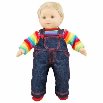 Adorable denim overalls, accented with red stitching, and a rainbow striped long sleeve tee will be a hit for every set of twins. Red tie up shoes also included. Compatible for use with 15 inch dolls like Bitty Baby Twins. Matching overall skirt for 15 inch dolls sold separately. Exclusively made by The Queen’s Treasures, offering the highest quality 18 inch Doll Furniture, 18 inch Doll Clothes, 18 inch Doll Shoes & 18 inch Doll Accessories! Safety Tested!